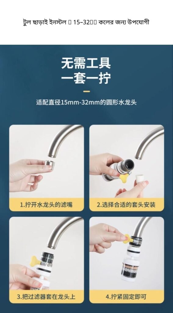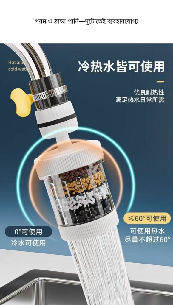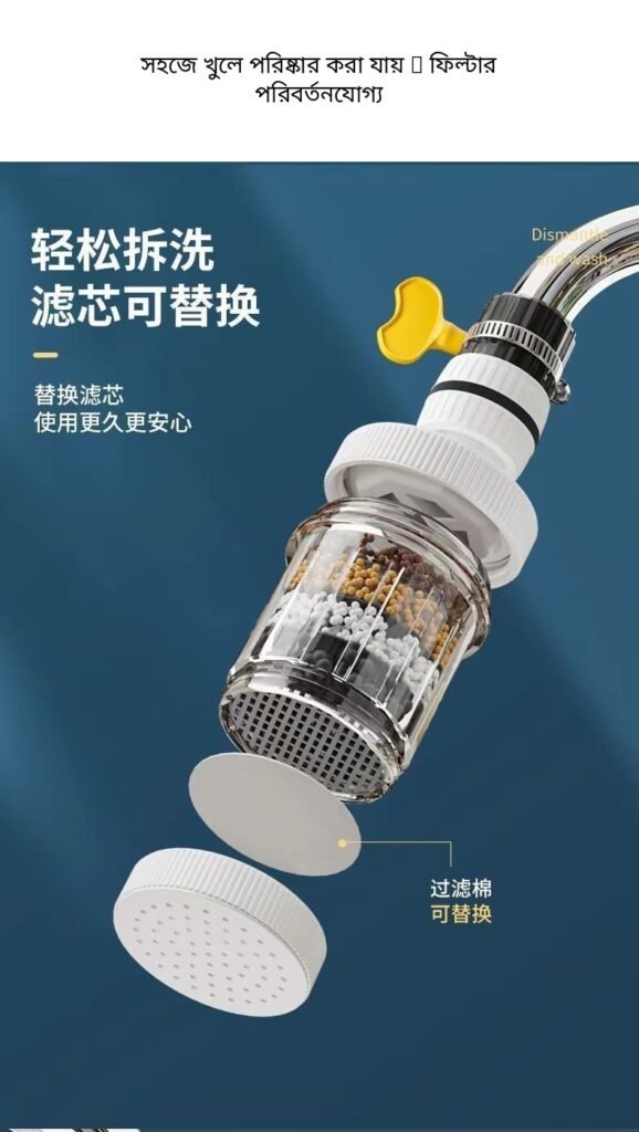 অনেক সময় tap-এর পানি সরাসরি ছিটে চারদিকে পড়ে sink নোংরা করে দেয়। আবার পানির মধ্যে dust, rust বা ছোট particles থাকতে পারে। এই filter ব্যবহার করলে পানি আরও smooth flow-তে বের হয় এবং unwanted particles কমাতে সাহায্য করে।